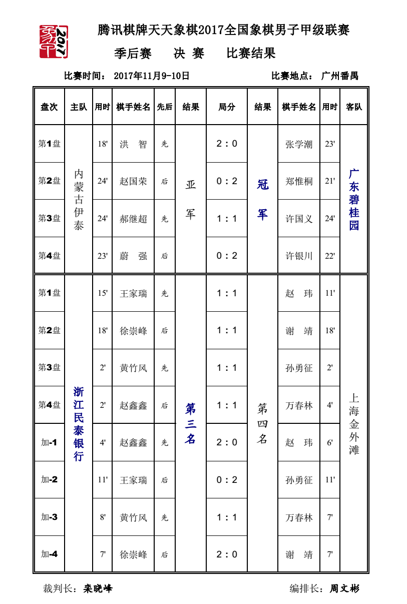 作者:观棋不语 更新时间:2017-11-10 13:55:01 浏览次数:1813中国棋牌网讯 11月10日,“腾讯棋牌•天天象棋”2017年全国象棋男子甲级联赛在广东番禺石碁中学尘埃落定,广东碧桂园击败内蒙伊泰,完成七冠伟业,内蒙伊泰亚军,浙江民泰银行季军。前三名分获30万、15万、10万元奖金。上海金外滩、杭州环境集团、江苏海特股份获四五六名。