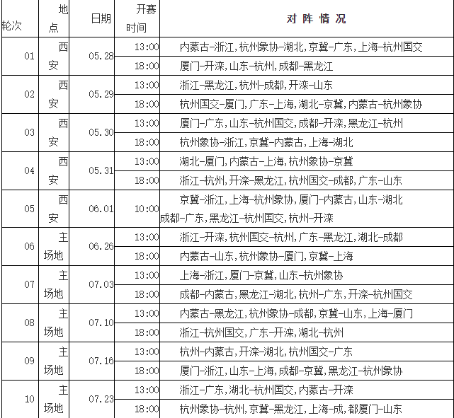 备受棋友期待的2016年象甲联赛即将于5月28日下午13:00时在古城西安打响,首轮内蒙古对阵浙江,杭州象协对阵湖北,京冀对阵广东,上海对阵杭州国交,中国象棋棋谱网将即时更新比赛棋谱。下面是联赛日程表: