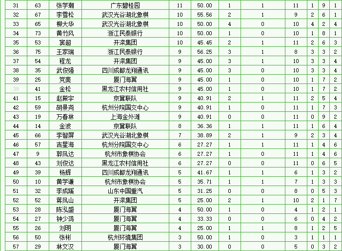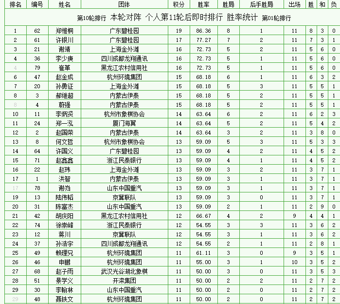 第11轮象甲联赛战罢后,从上图看出,大家关心的棋手如: